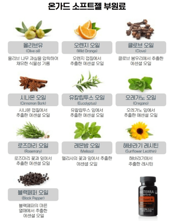 온가드 소프트젤 부원료 온가드 오일(오렌지, 클로브, 시나브, 유칼립투스, 로즈마리) 외에 블랙페퍼, 오레가노, 멜리사, 올리브유, 해바라기유 등이 첨가되었습니다.